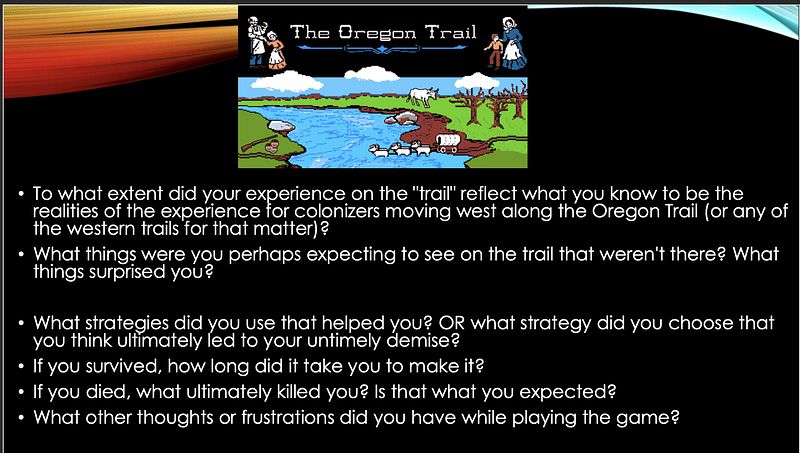 Slide with Oregon Trail opening screen shown as well as writing prompts