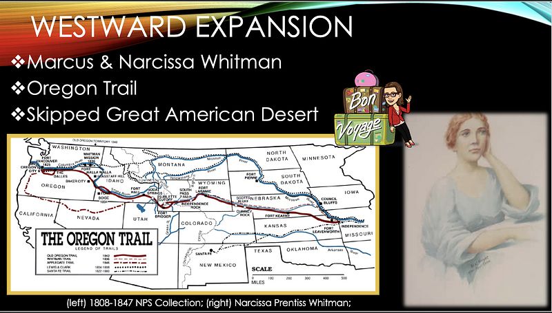 Westward Expansion slide noting Marcus & Narcissi Whitman, Oregon Trail, and Skipped Great American Desert