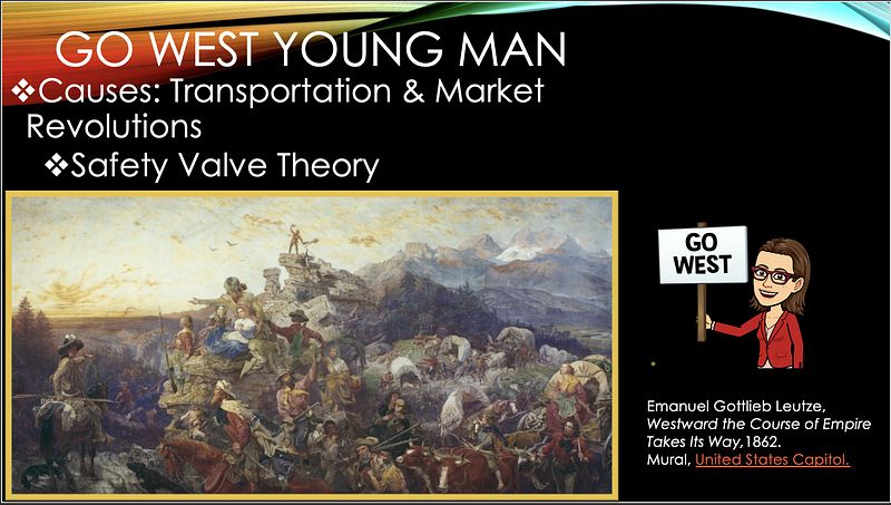 Slide titled "Go West Young Man" listing "Causes: Transportation & Market Revolutions" and "Safety Valve Theory."
