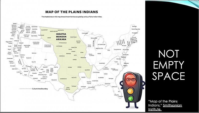 Slide titled "Not Empty Space" with a map courtesy of the Smithsonian showing Plains Indians